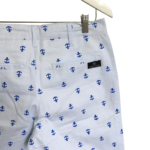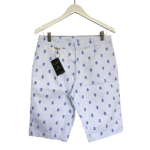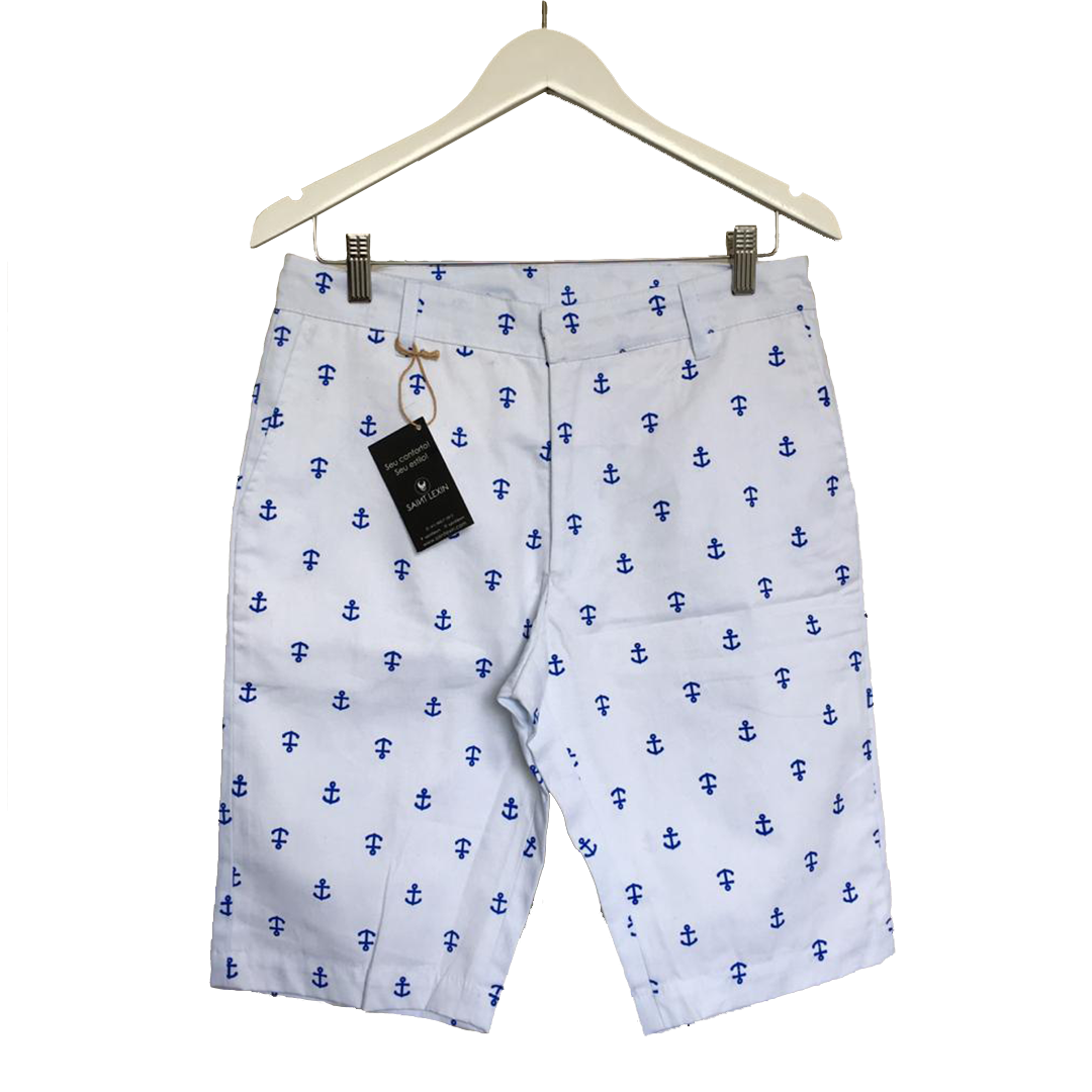 Bermuda estampada com ancoras, confeccionada em algodão sarjado com bolsos faca frontais e bolsos embutidos nas costas.