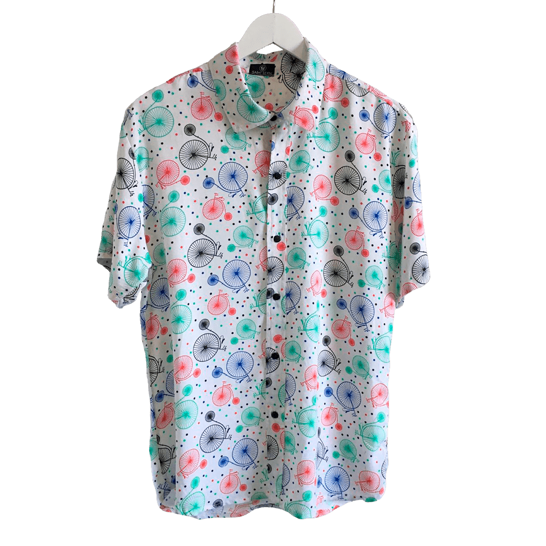 Camisa modelagem slim, confeccionada em viscose estampada, manga curta, com abotoamento clássico e bainha levemente fraldada.