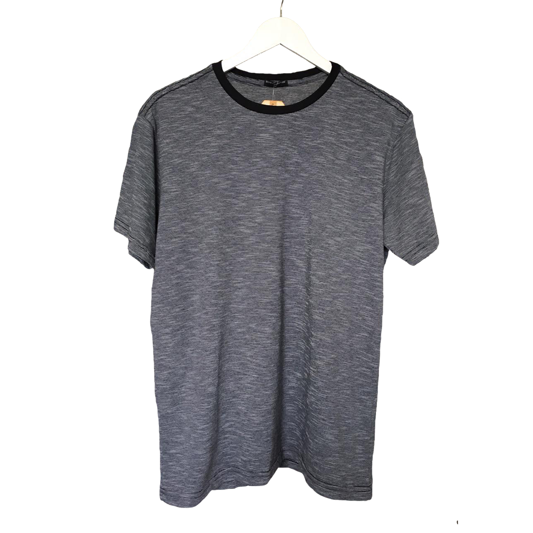 T-shirt básica e estampa em listras, manga curta e gola careca.