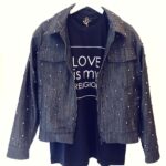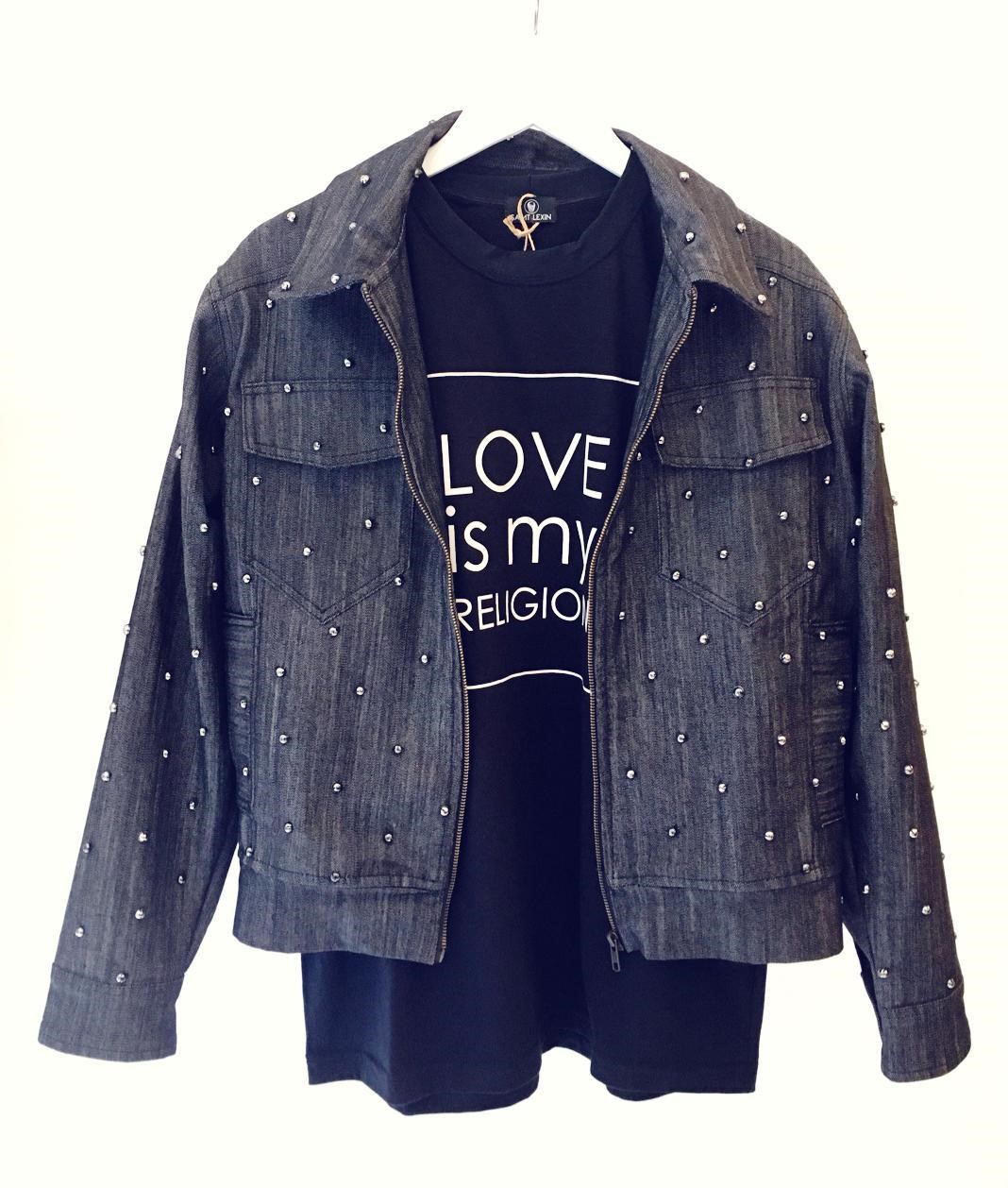 Jaqueta jeans bordada em chatons, peça tamanho ÚNICO, veste P e M.